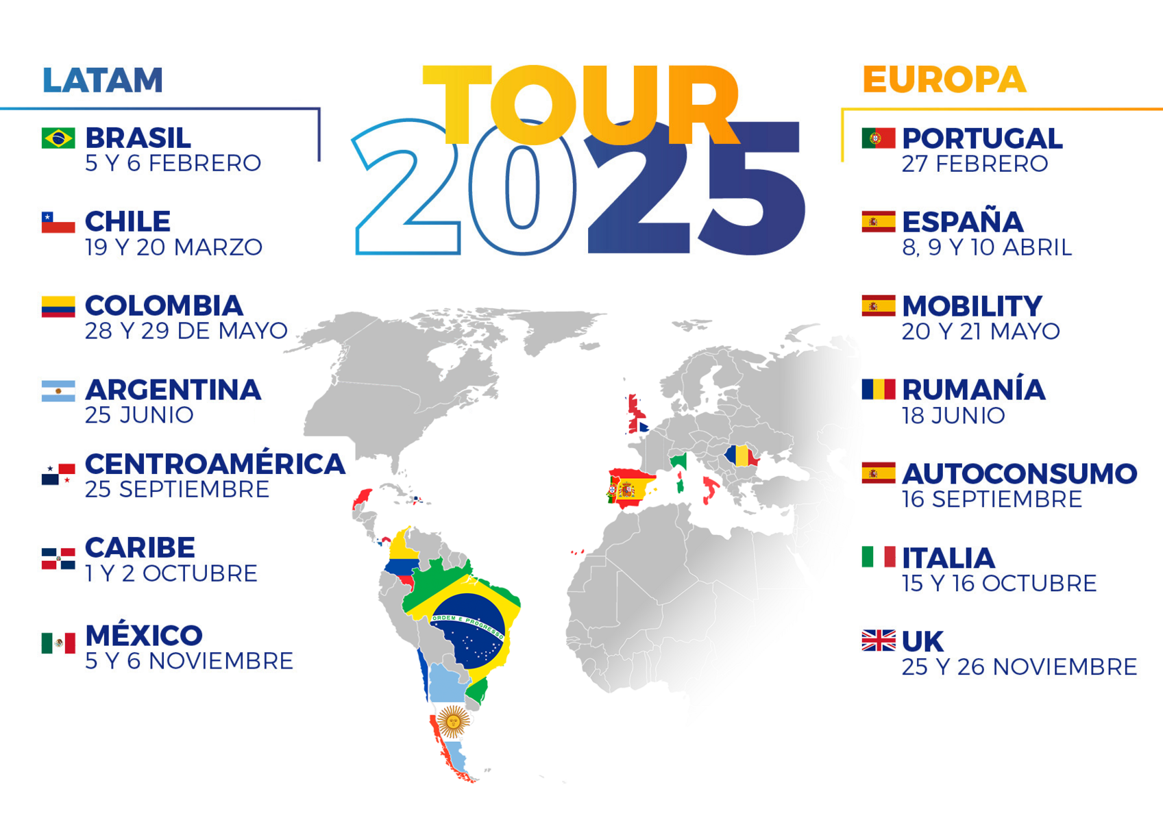 El Energyear Tour 2025 estará comprendido de quince eventos en las regiones más importantes de Latinoamérica y Europa, enfocados en las oportunidades del sector renovable en dichas regiones.